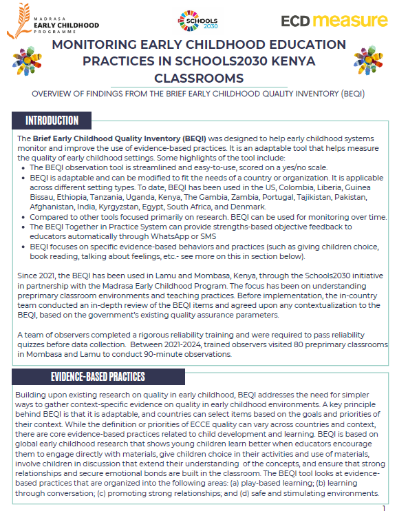 Since 2021, the BEQI has been used in Lamu and Mombasa, Kenya, through the Schools2030 initiative in partnership with the Madrasa Early Childhood Program. Read a summary of results from 2021-2024 here.